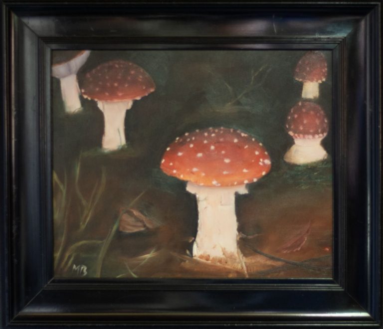 Paddenstoel, rood met witte stippen. Incl. antieke lijst.